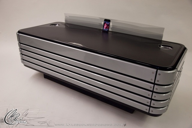 Ma non finisce qui: dentro a questo esemplare di design totalmente realizzato a mano, si nasconde una potente doking station dotata di subwoofer ed attivabile da una superfice touch.