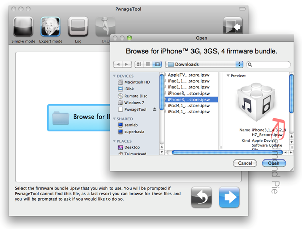 Ciò farà in modo che iTunes vi permetta di selezionare un firmware presente sul vostro computer. Scegliete dunque il firmware personalizzato creato da Pwnage Tool che dovrebbe essere situato sul desktop. Una volta scelto il firmware, clickate su “Apri”.