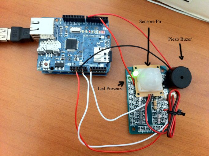 - il programma nell’arduino controlla lo stato del sensore pir e quando il sensore rileva un movimento il led lampeggia 2 volte, il Buzer segnala la presenza suonando, poi viene richiamato uno script php dal web server al suo interno che attiva 2 funzioni: una per l’invio della notifica push e l’altra per l’invio della email.