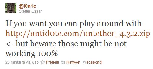 Tramite Twitter i0n1c ha appena rilasciato un pacchetto .zip contenente il file che consente il Jailbreak Unthetered di iOS 4.3.2. Attualmente il processo di sblocco però è consigliato solamente ad utenti esperti e potrebbe non funzionare al 100%.