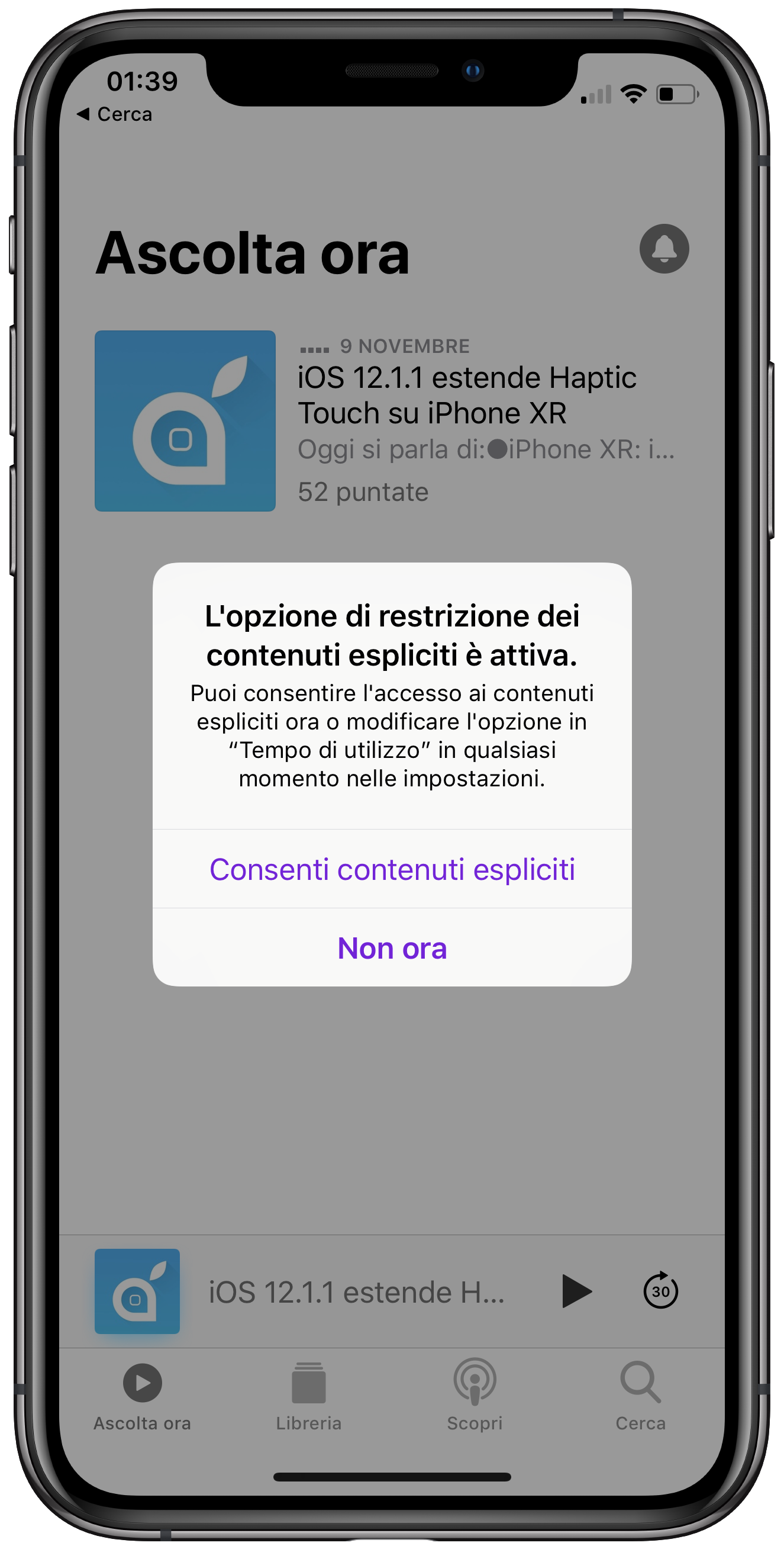 2. Aprite l’applicazione Podcast ed attendete qualche secondo, apparirà un messaggio di sistema dove vi verrà chiesto di consentire i contenuti espliciti. Accettate cliccando su “Consenti contenuti espliciti”.