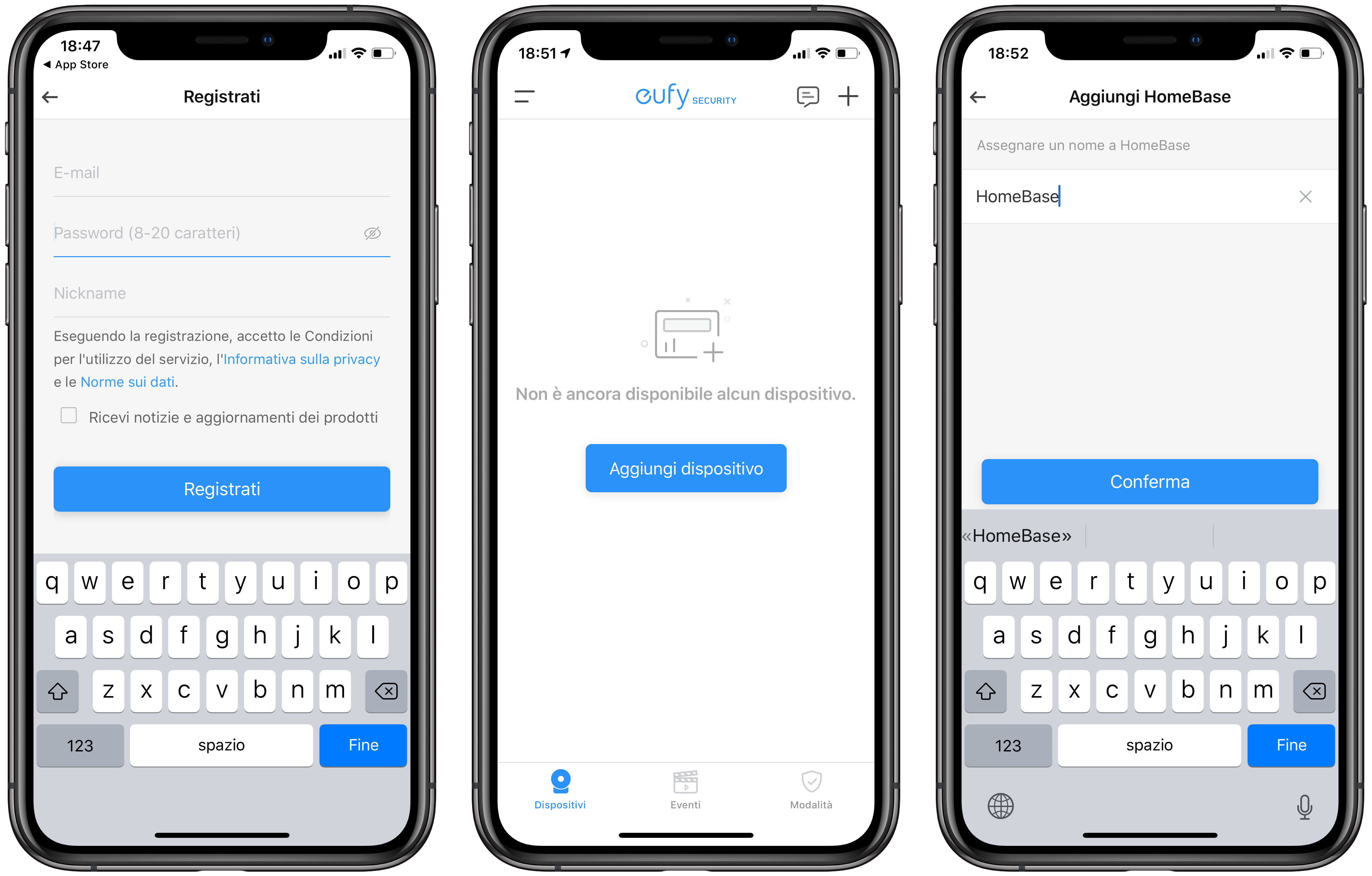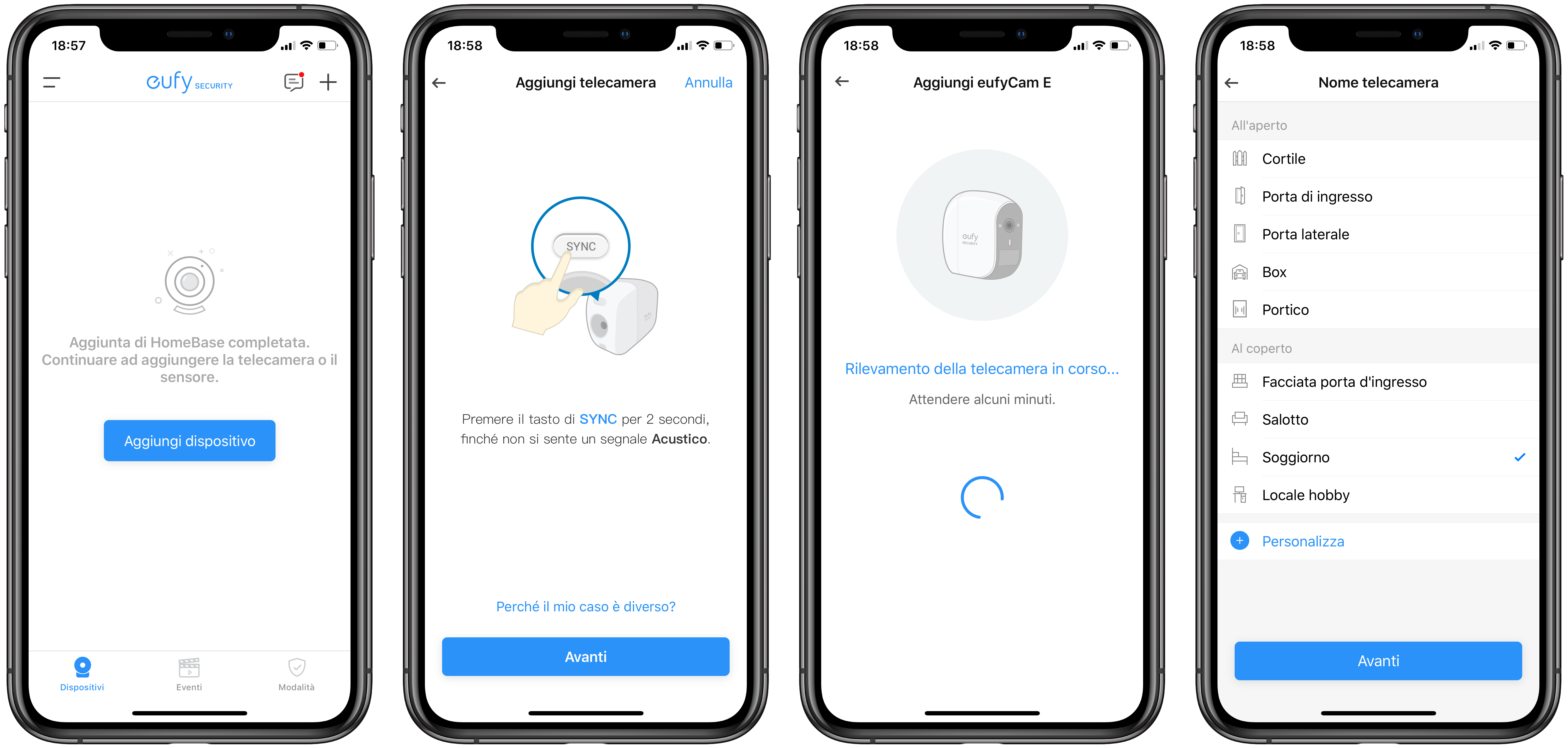 Altro punto a favore delle eufyCam E è la semplicità della configurazione iniziale. Una volta installata l’applicazione dedicata, disponibile sia per iOS che per Android ed effettuata la registrazione, basterà avviare la HomeBase, che va collegata direttamente al modem tramite cavo ethernet. Aprendo l’applicazione, la stessa ci guiderà nell’aggiunta dei diversi dispositivi; partendo proprio dalla HomeBase.