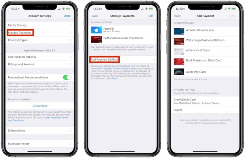 Per cambiare sistema di pagamento bisogna entrare in Impostazioni > iTunes e App Store > toccare il proprio indirizzo email > Visualizza ID Apple > Gestisci pagamenti > Aggiungi metodo di pagamento.