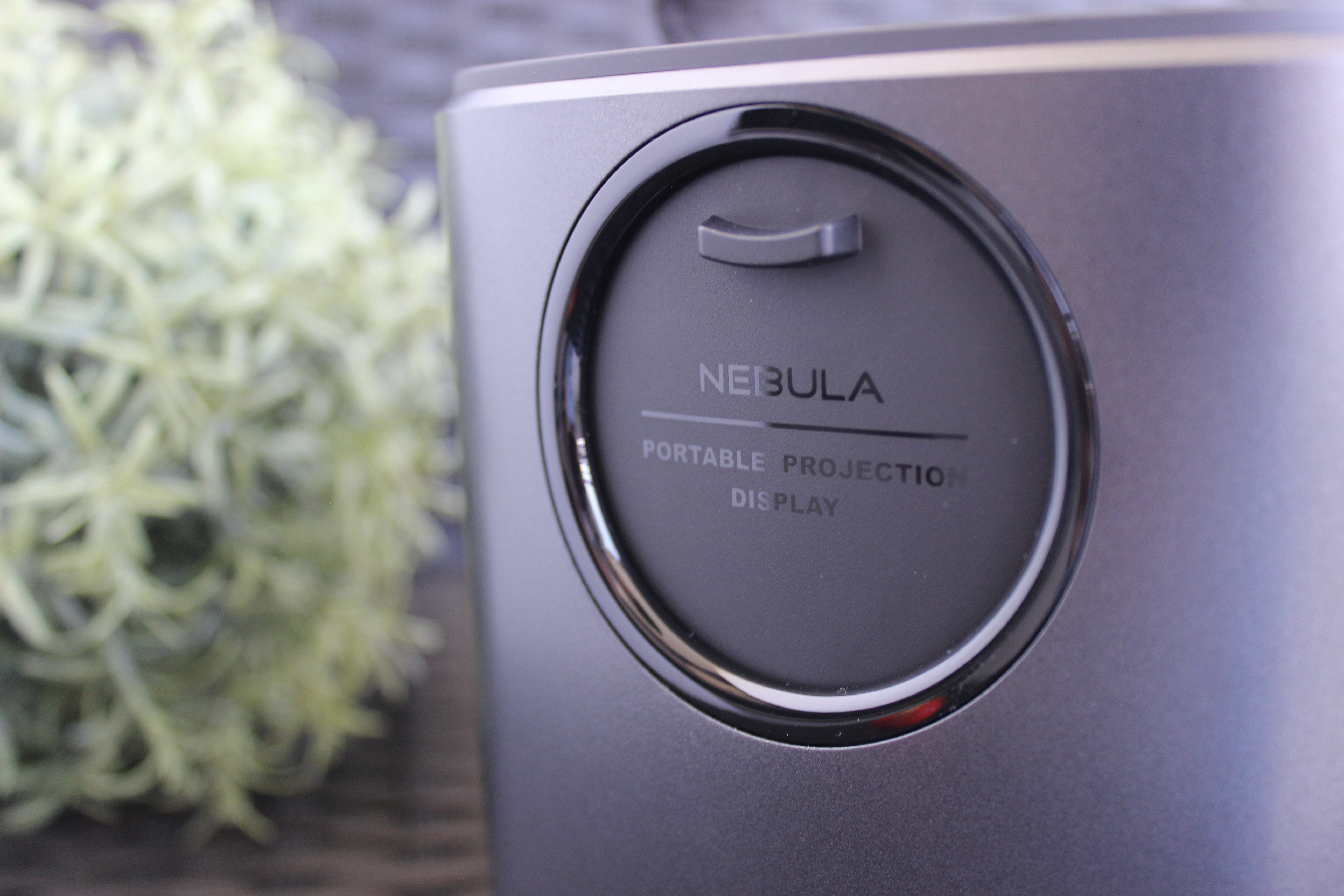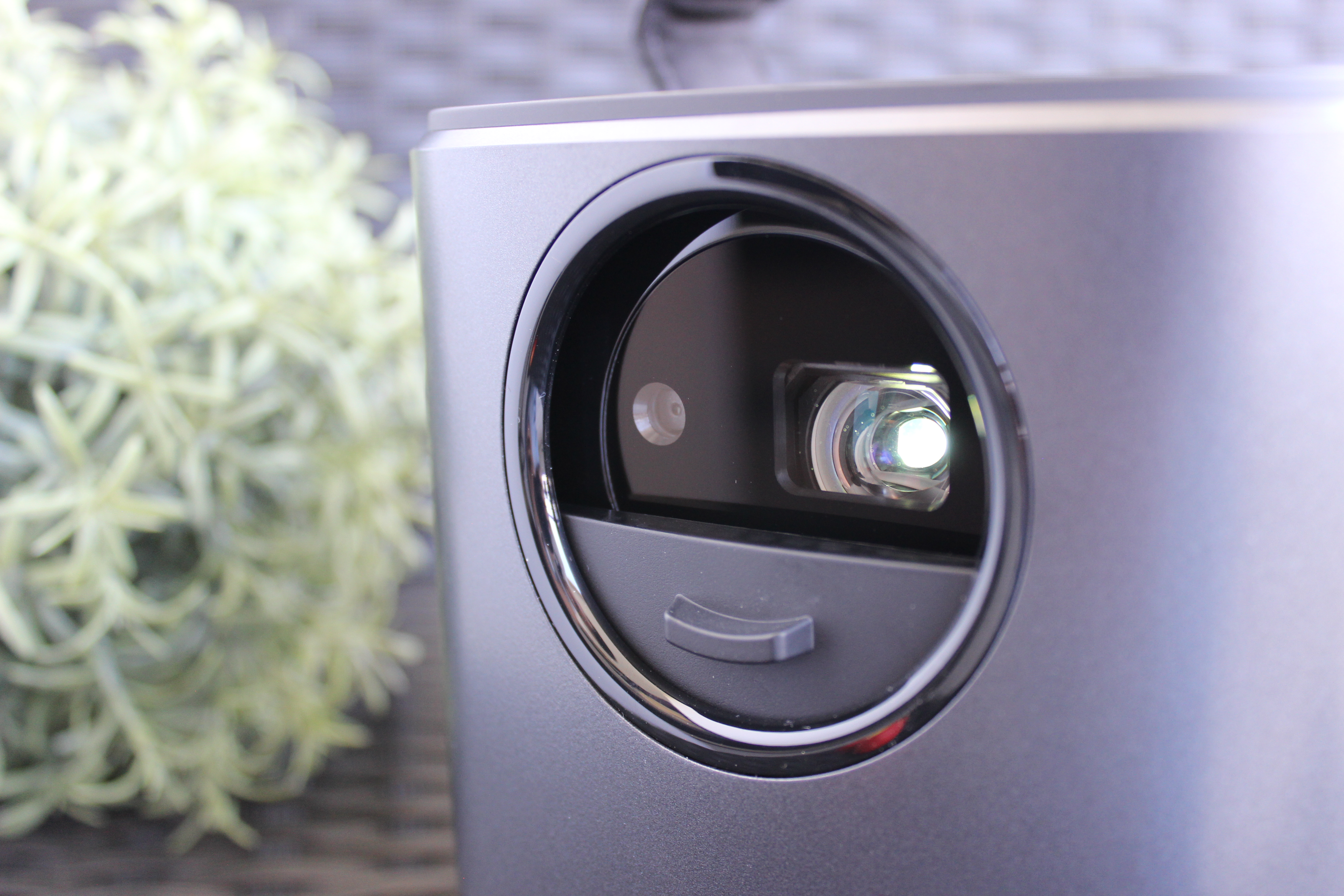 Sulla parte frontale troviamo uno sportellino movibile che protegge l’ottica del proiettore e, allo stesso tempo funge anche da tasto per l’accensione e lo spegnimento.