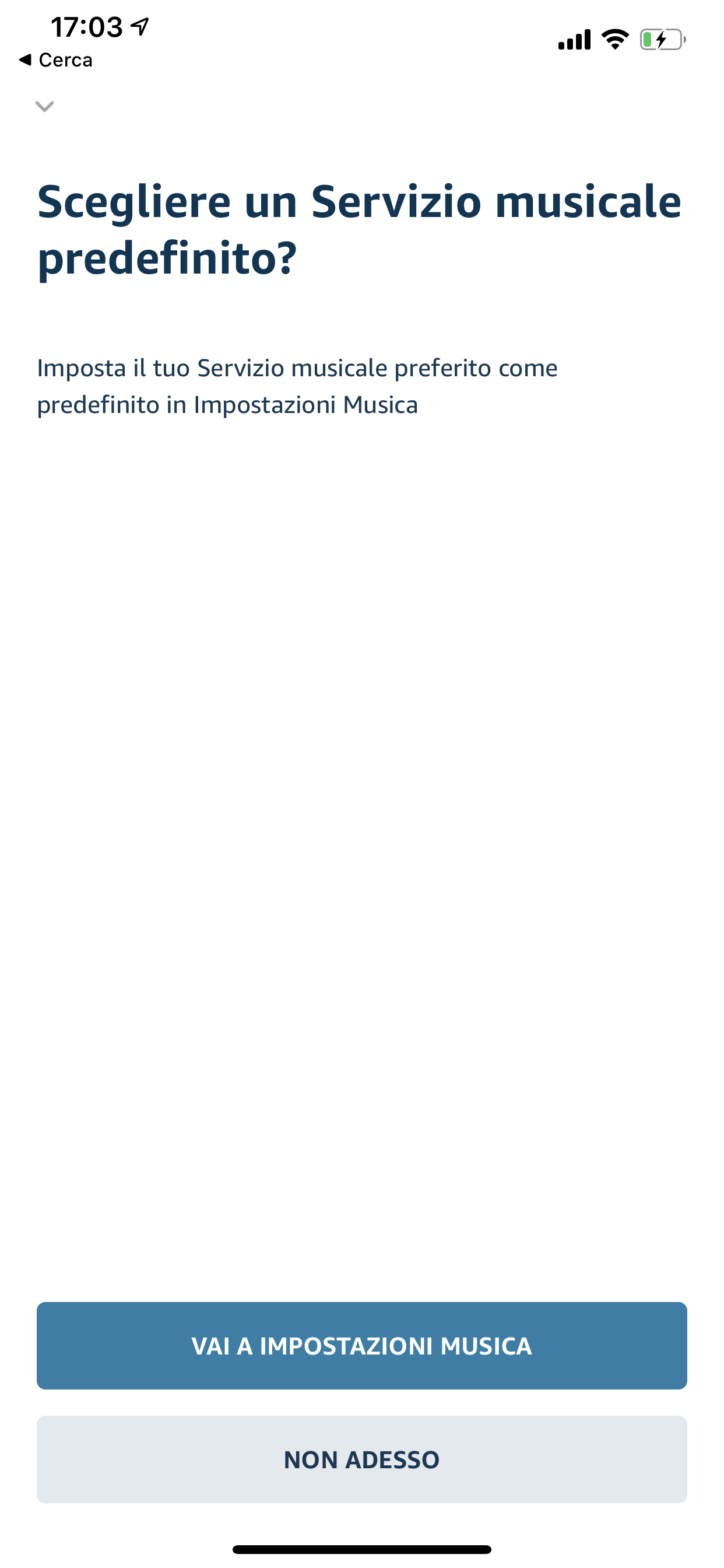 5. Dopo aver collegato l’account ad Amazon Alexa, si aprirà una nuova schermata che vi chiederà se volete selezionare Apple Music come servizio predefinito. Basterà cliccare su “Vai a impostazioni musica” per recarvi sulle impostazioni.
