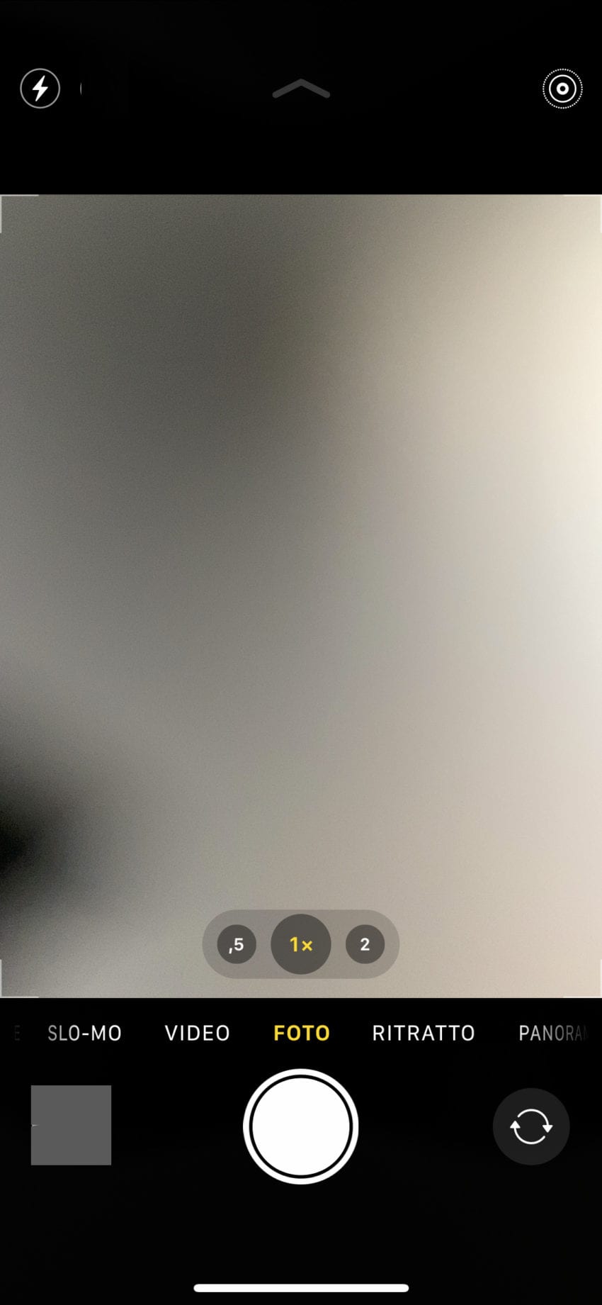 Fotocamera ha una nuova interfaccia, dove nella parte bassa restano i soliti tasti per passare da modalità Foto a video, slow motion e così via, però in alto, adesso abbiamo soltanto due tastini. Quello a sinistra disattiva o attiva il flash (On e Off, che cambia ad ogni tocco, senza le varie opzioni), e quello a destra attiva o disattiva le Live Foto. Non c’è più nessun altro tasto visibile.