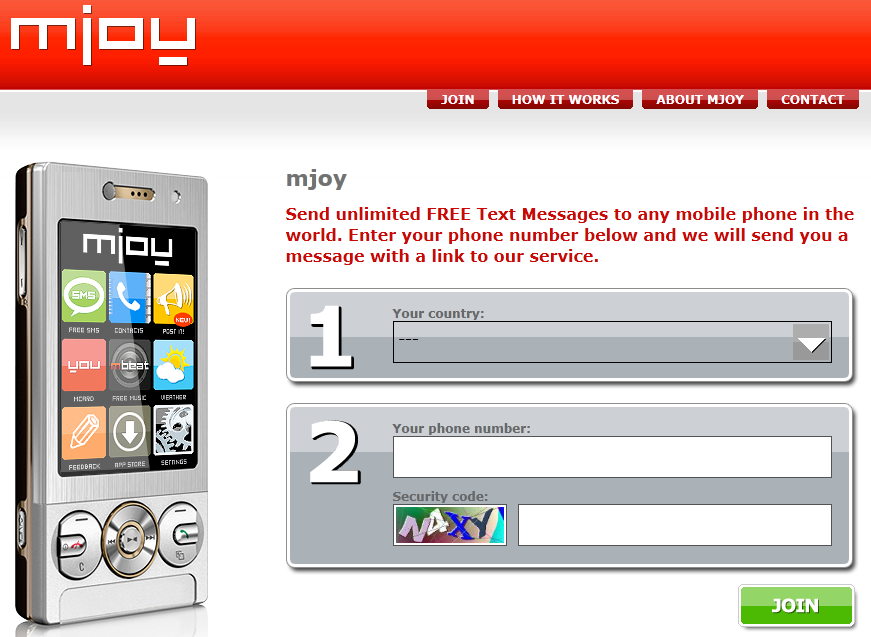 Mjoy è un servizio molto interessante, si tratta di una web-app (quindi utilizzabile con ogni tipo di dispositivo mobile che si connetta ad internet) che permette di inviare sms in modo del tutto gratuito ai vostri amici. Per prima cosa bisogna effettuare una registrazione gratuita e veloce all’indirizzo http://mjoy.com/ (è possibile registrarsi anche dal PC/MAC) inserendo semplicemente il Paese di provenienza e il vostro numero di telefono (Senza il prefisso internazionale +39), subito dopo riceverete sul vostro iPhone un sms contenente un link per la conferma ed attivazione del servizio (il messaggio potrebbe arrivare dopo qualche minuto, dovrete pazientare un po).