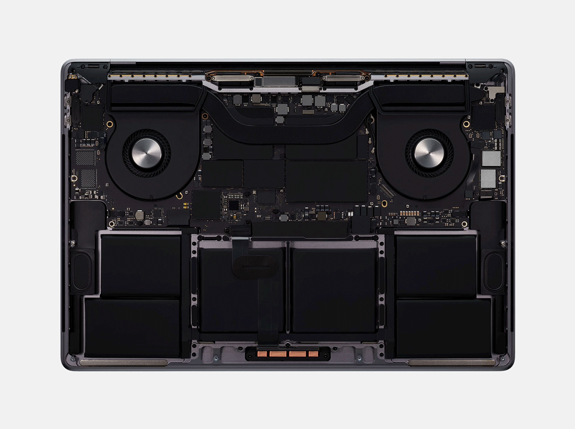 Il MacBook Pro da 16 pollici utilizza l’architettura termica più avanzata di sempre in un notebook Mac per consentire al sistema di funzionare a potenza maggiore per periodi di tempo prolungati. Il sofisticato design della ventola presenta una girante più grande con pale estese insieme a prese d’aria più grandi, con un conseguente aumento del flusso d’aria del 28 percento, mentre il dissipatore di calore è più grande del 35 percento, consentendo una dissipazione di calore significativamente maggiore rispetto a prima. Insieme, questi progressi nella capacità di raffreddamento consentono al MacBook Pro da 16 pollici di sostenere fino a 12 watt in più durante carichi di lavoro intensivi rispetto al design precedente.