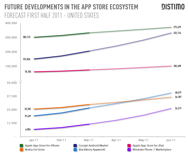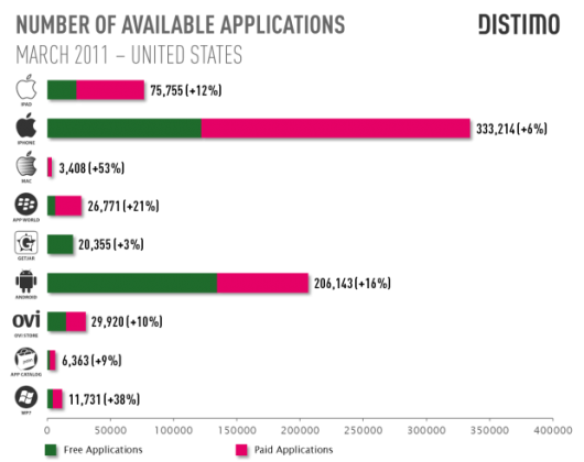 Nel mese di Marzo l’AppStore è cresciuto molto meno rispetto al Market di Android che, secondo le previsioni, supererà il rivale entro soli cinque mesi. Infatti notiamo come lo Store virtuale di Apple sia cresciuto solo del 6% rispetto al 16% dell’antagonista. Ma le analisi di Distimo, presentate da TechCrunch non mostrano solo questo.
