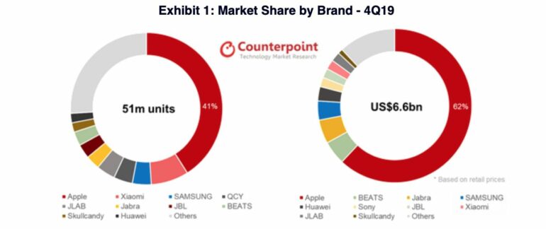 Il lancio degli AirPods Pro alla fine di ottobre ha aiutato l’azienda a registrare una crescita costante del 44% nel Q4 2019, con 6 milioni di unità vendute nonostante la carenza di approvvigionamento. La quota di mercato di Apple è scesa leggermente al 41% su base trimestrale, nel tentativo di tenere il passo con una rapida crescita complessiva del mercato; la quota di mercato per l’intero anno ha raggiunto il 47%.