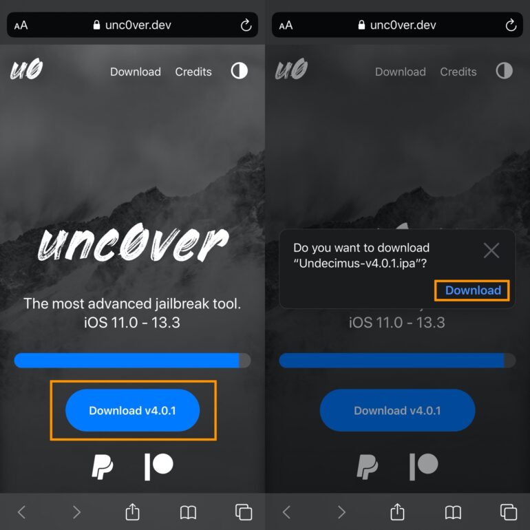 - Andiamo su unc0ver.dev in Safari sul nostro iPhone o iPad e cicchiamo su download: