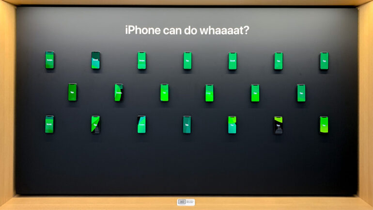 A un anno dal suo lancio di una pagina web chiamata “iPhone can do whaaat?“, Apple ha installato una parete interattiva in un numero limitato di Apple Store. Nella parete sono montati 20 iPhone, ognuno dei quali visualizza informazioni relative a funzionalità quali privacy, resistenza all’acqua e altro ancora.