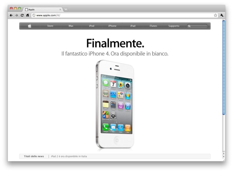 Apple ha da poco aggiornato l’Home Page del sito web italiano aggiungendo un’immagine dell’iPhone 4 bianco con tanto di scritta annessa: “Finalmente. Il fantastico iPhone 4. Ora disponibile in bianco”.