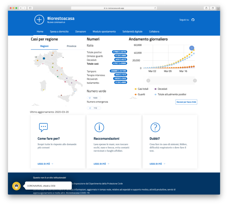 Qualche minuto fa, in redazione ci hanno segnalato una WebApp davvero ben fatta e soprattutto OpenSource per tracciare la situazione del Coronavirus in Italia.
