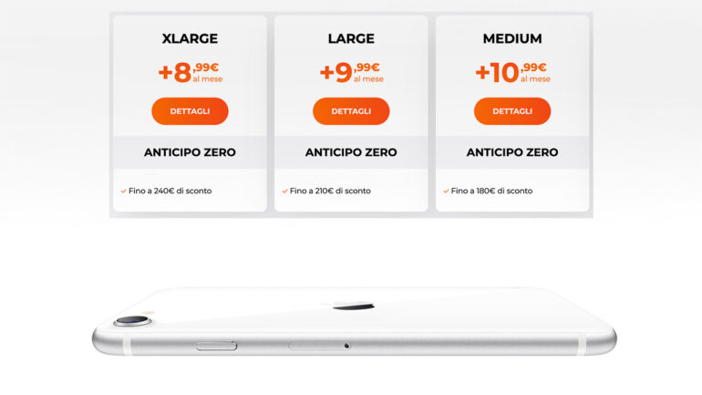 L’offerta Medium offre 20 giga di internet alla massima velocità, minuti illimitati e 200 SMS, un piano che alla maggior parte degli utenti può andare benissimo. Il costo del piano è di 12,99€ al mese. A cui vanno sommati 10,99€ al mese per avere l’iPhone SE da 64GB. Come già detto, le rate saranno 24, al termine delle quali si continuerà a pagare soltanto il piano telefonico.