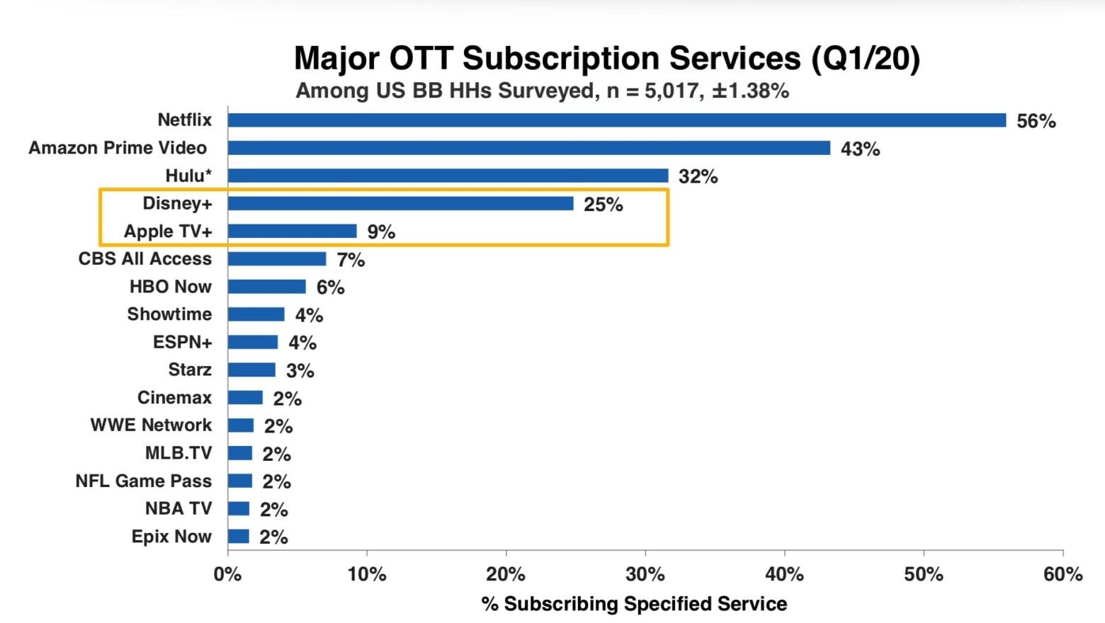 “Apple TV+ è stato lanciato nello stesso periodo di Disney +, ma non ha registrato una crescita esplosiva come quest’ultimo”, osserva il rapporto. “Tuttavia, con un’offerta promozionale legata agli acquisti di dispositivi Apple e una piccola scuderia di programmazione originale, il servizio ha raggiunto quasi il 10% di adozione.”