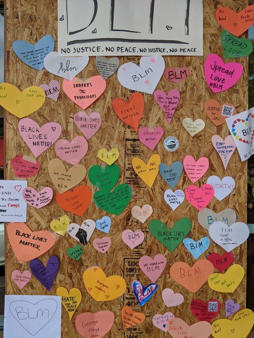 A Naperville, nell’Illinois, alcuni manifestanti pacifici hanno ricoperto la facciata di Apple Main Place con bigliettini a forma di cuore, ognuno con un messaggio di speranza sul movimento Black Lives Matter.