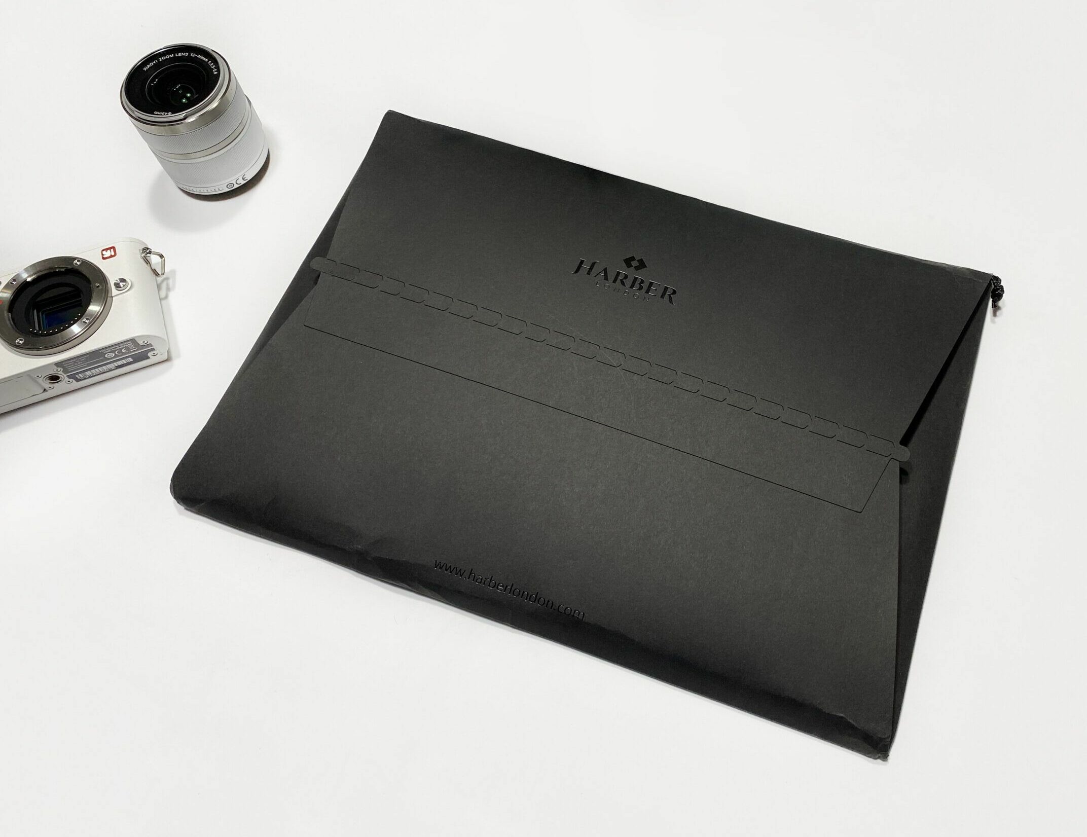 La cura dei dettagli è molto elevata. Già dal packaging riusciamo a capire che si tratta di un prodotto che vale. La custodia arriverà all’interno di una busta completamente nera, simile a quella dello spot Apple dei primi MacBook Air. Sulla busta troveremo inciso il logo dell’azienda e all’interno, di facciata, subito due cartoncini molto spessi e ben disegnati. Sul primo c’è scritto Thank You, per ringraziarci dell’acquisto, sul retro troveremo un Coupon di sconto per successivi acquisti e sul secondo cartoncino alcune stampe di altri prodotti realizzati dall’azienda con foto professionali. Ogni prodotto viene poi avvolto all’interno di un sacchetto in tela, anch’esso marchiato con il logo di Harber London.