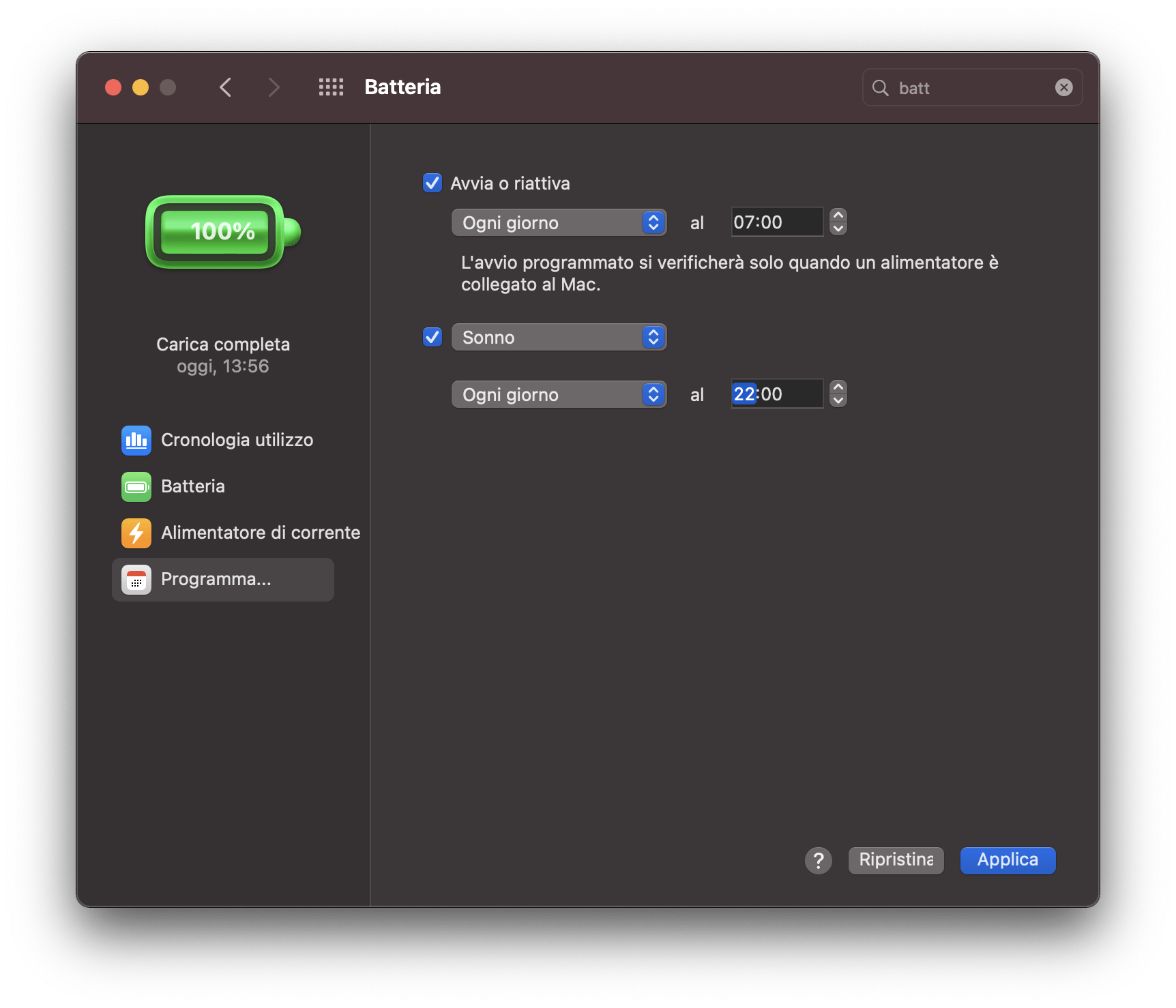 C’è anche un’opzione per pianificare l’avvio o la riattivazione del Mac ad un orario specifico. Se vogliamo che il nostro dispositivo sia pronto in un momento specifico e che passi automaticamente alla modalità di sospensione quando non lo stiamo utilizzando, la funzione di pianificazione può essere di grande aiuto.