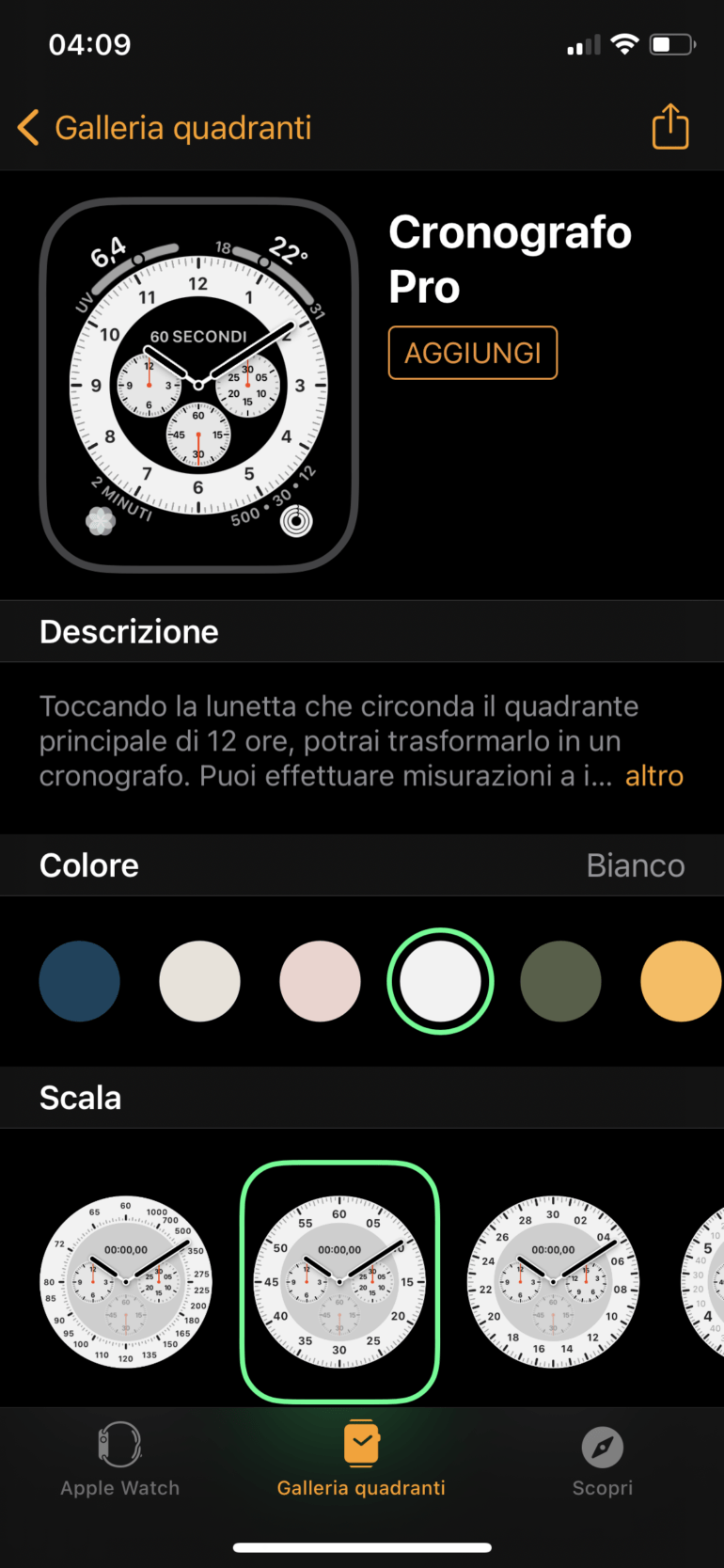 Toccando la lunetta che circonda il quadrante principale di 12 ore, potrai trasformarlo in un cronografo. Puoi effettuare misurazioni a intervalli di 60, 30, 6 o 3 secondi. In alternativa puoi selezionare la nuova opzione tachimetro per misurare la velocità sulla base del tempo impiegato a coprire una distanza fissa.