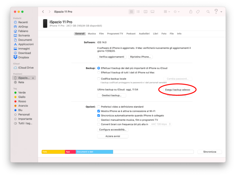 Il Backup con iTunes o con il Finder avviene in maniera molto semplice. Dalla schermata principale non dovrete fare altro che cliccare sul tasto “Esegui backup adesso“, come mostrato nell’immagine qui sopra. Il backup verrà salvato in locale nel vostro computer. Vi consigliamo di non utilizzare la “codifica backup”.