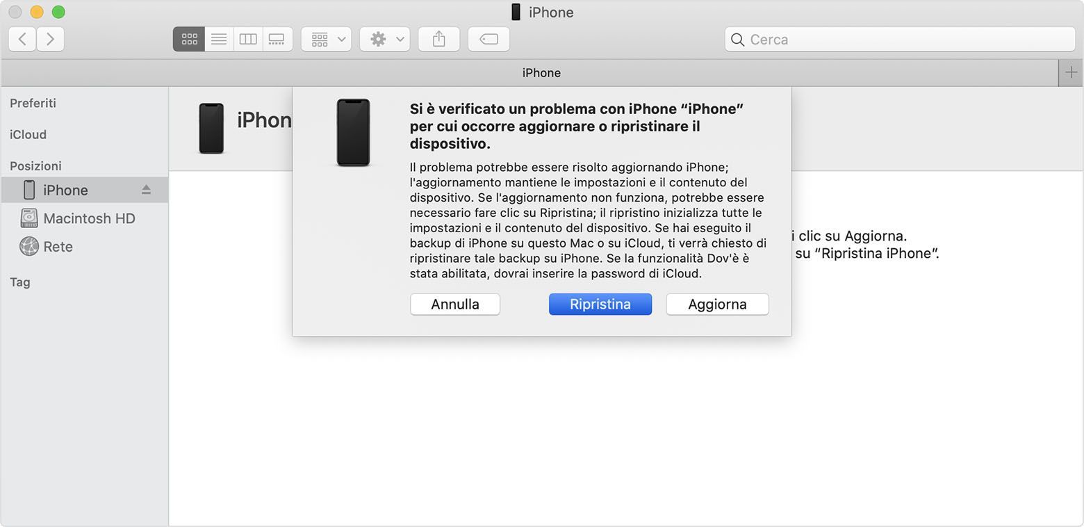 4. Una volta rilevato il dispositivo in modalità DFU, iTunes o Finder lo rileveranno e chiederanno se si desidera ripristinare il telefono. Premiamo e premuto il tasto alt/opzioni della tastiera del Mac oppure il tasto SHIFT della tastiera su PC e con il mouse clicchiamo su Ripristina iPhone / iPad.