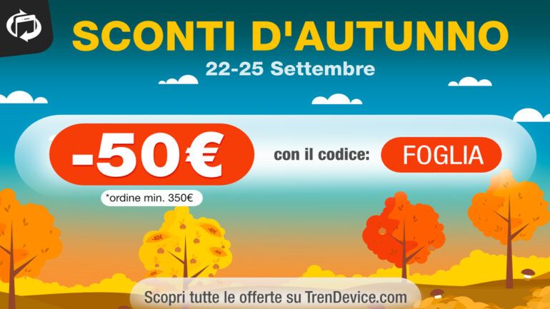 L’Autunno è già iniziato e TrenDevice ha deciso di festeggiare l’inizio della nuova stagione con uno Sconto di -50 € su tutto il catalogo. Il codice da inserire per ottenere lo sconto è FOGLIA ed è valido per ordine minimo di 350 €. La promozione è valida fino a venerdì 25 Settembre.