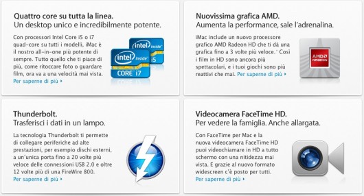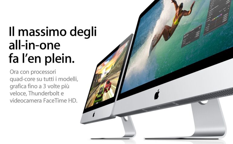 Apple ha annunciato oggi l’aggiornamento della linea di all-in-one iMac, che includono ora processori quad-core di ultima generazione, nuova grafica potente, rivoluzionaria tecnologia I/O Thunderbolt ad alta velocità e una nuova videocamera FaceTime HD. A partire da €1.149, il nuovo iMac è fino al 70% più veloce, mentre i nuovi processori grafici offrono prestazioni fino a tre volte superiori rispetto alla generazione precedente.* “I nostri clienti amano il case in alluminio, il favoloso display e il design all-in-one dell’iMac,” ha dichiarato Philip Schiller, Senior Vice President Worldwide Product Marketing di Apple. “Con processori quad-core all’avanguardia, nuova potente capacità grafica, tecnologia Thunderbolt e una videocamera FaceTime HD, abbiamo migliorato ulteriormente quello che era già il miglior desktop al mondo.”