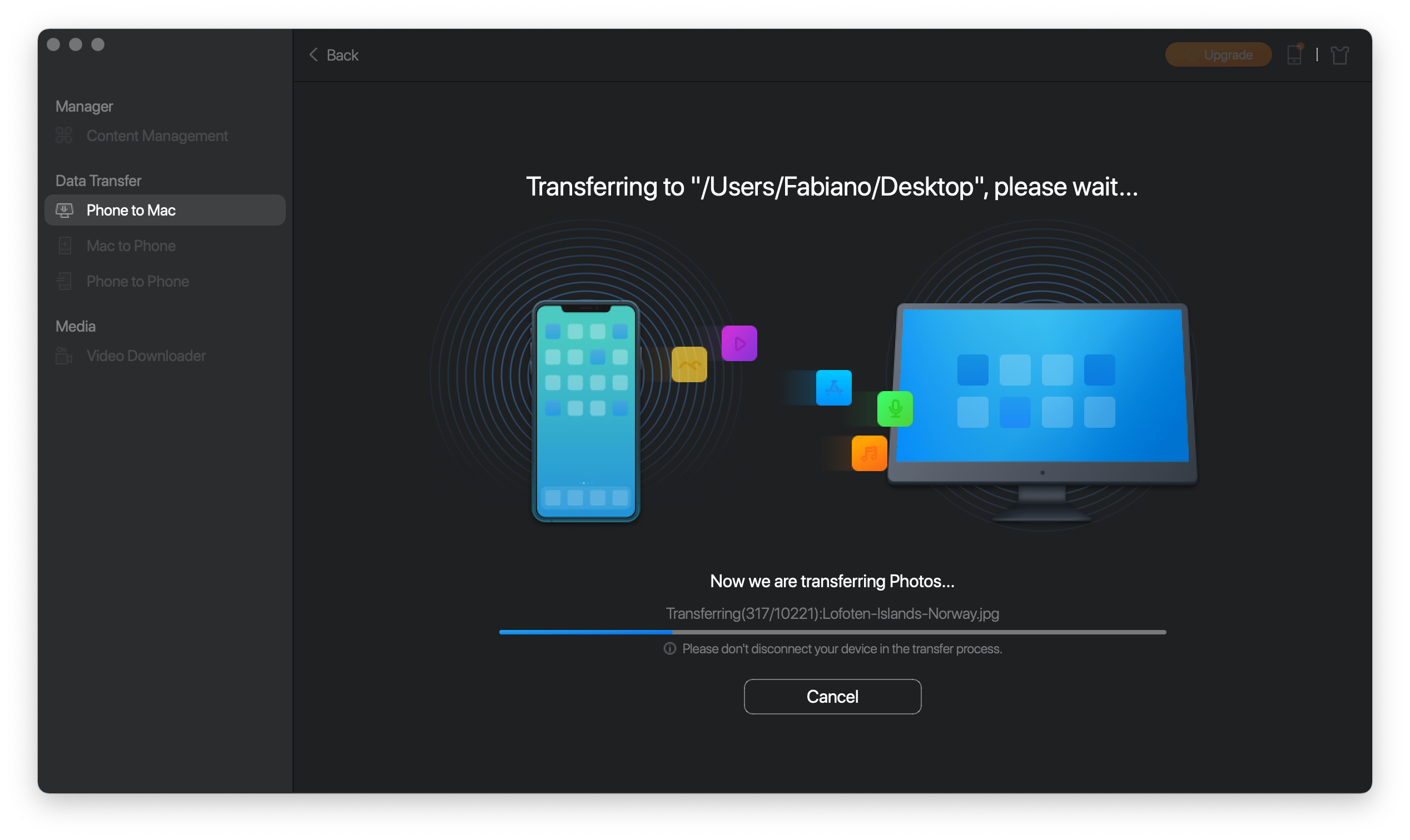 Quando siamo soddisfatti, clicchiamo su Transfer e l’applicazione inizierà a trasferire tutti i dati sul Desktop. Le immagini non saranno criptate e verranno ricopiate sul nostro computer mantenendo esattamente la stessa suddivisione in Album che troviamo su iPhone.