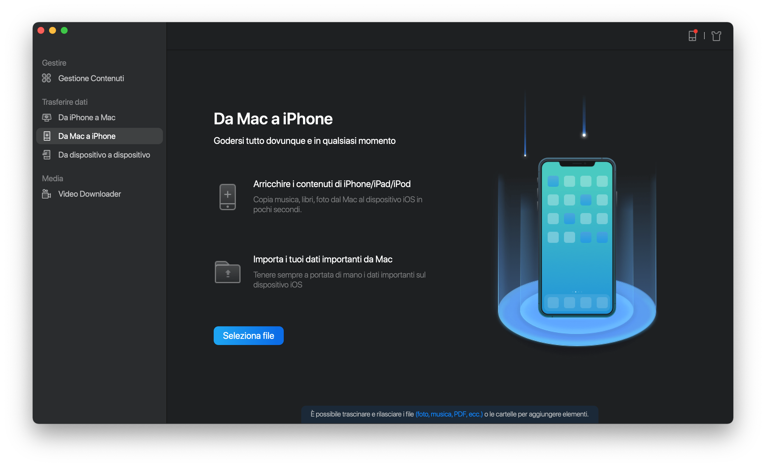 Nel processo inverso di trasferimento, avremo sempre una schermata introduttiva, dalla quale dovremo cliccare il tasto Seleziona file.