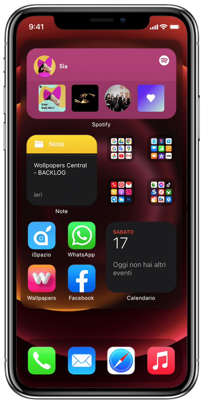 Per ottenere lo stesso risultato, utilizziamo uno sfondo che crea un riquadro intorno a tutte le icone della Home Screen. In alto abbiamo utilizzato il Widget Medium di Spotify, ma ovviamente potete utilizzare qualsiasi Widget, segue un Widget Small con 4 cartelle sulla destra, alle quali abbiamo tolto il nome per alleggerire il design e creare uno stile più sobrio. Infine abbiamo 4 icone di applicazioni sulla sinistra ed un altro widget small a destra. Per riprodurre questo design, bisogna creare anche delle cartelle “vuote” cioè senza nome in cui racchiudere varie applicazioni. Abbiamo visto che non tutti sanno come eseguire questa operazione e quindi ecco subito un articolo che ve lo spiega.