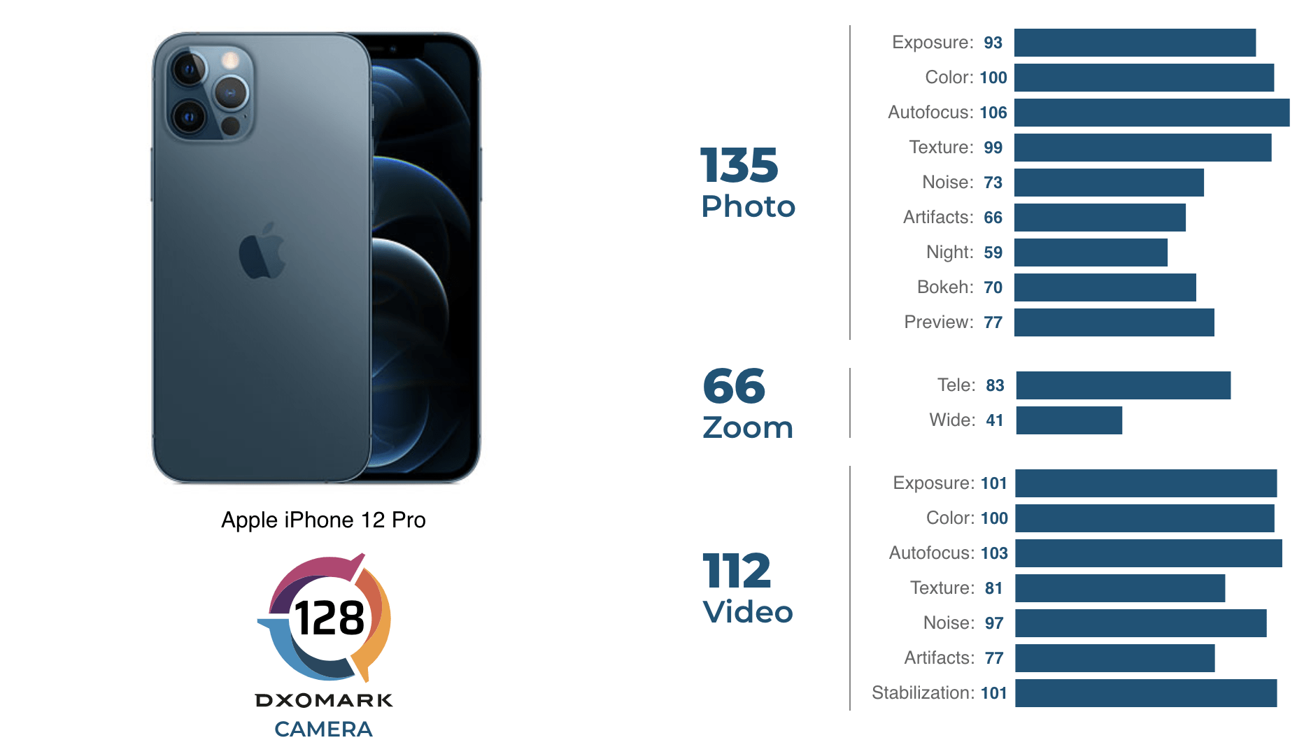 Con un punteggio complessivo della fotocamera DXOMARK di 128, l’iPhone 12 Pro è tra i primi cinque nella nostra classifica, migliorando di quattro punti l’11 Pro Max dello scorso anno e sostituendolo come il miglior dispositivo Apple nel nostro database. Il punteggio complessivo si basa su un punteggio elevato di 135 per le foto e un ottimo punteggio video di 112. Con un punteggio di 66, lo zoom è l’area in cui l’iPhone 12 Pro perde alcuni punti contro il migliore della categoria, principalmente a causa del suo teleobiettivo che offre solo un ingrandimento ottico 2x.