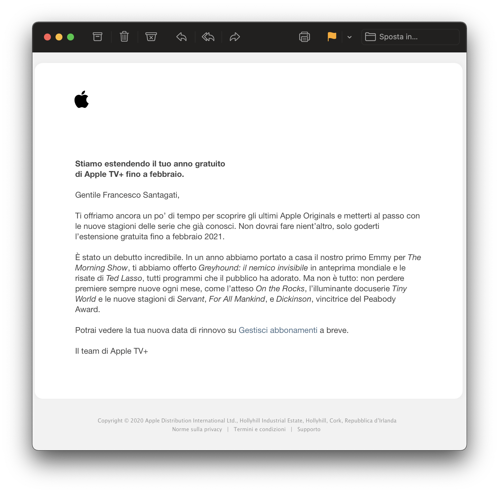 Gli abbonati a Apple TV+ che hanno pagato un piano annuale o mensile hanno iniziato a ricevere una e-mail da parte di Apple che informa loro che riceveranno un rimborso di 4,99 € per ogni mese di abbonamento fino a Gennaio 2021.