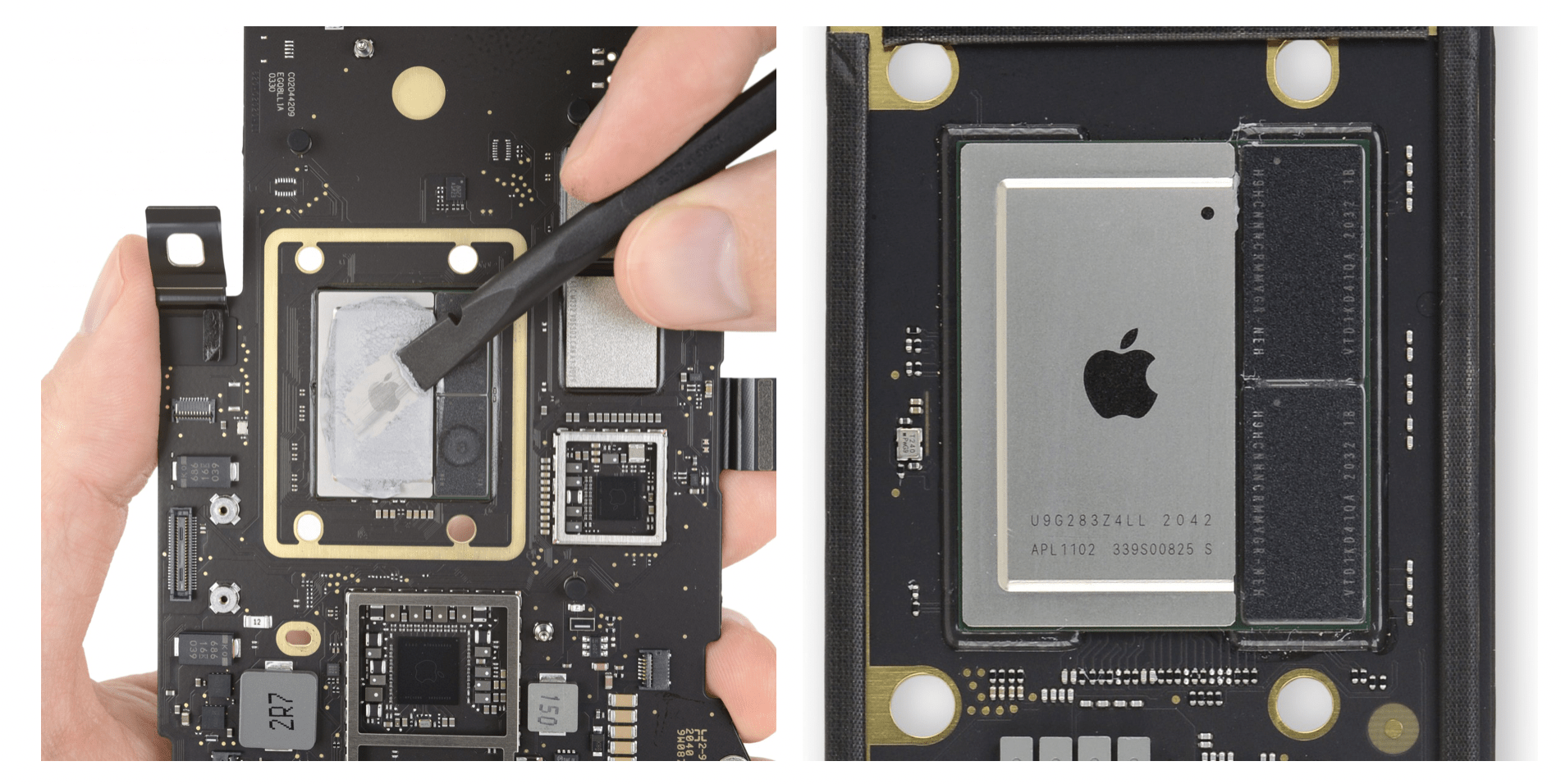 iFixit afferma che la memoria integrata rende le riparazioni sui Mac M1 molto più difficili. Nota che non c’è un chip T2 progettato da Apple su questi modelli, perché la funzionalità di sicurezza T2 è integrata direttamente nel chip M1.