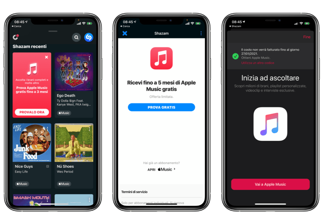 Una volta aperta l’app Apple Music ci verranno offerti da 1 a 5 mesi gratuiti del servizio. In alternativa, possiamo trovare il banner della promozione all’interno della sezione “Shazam recenti”: