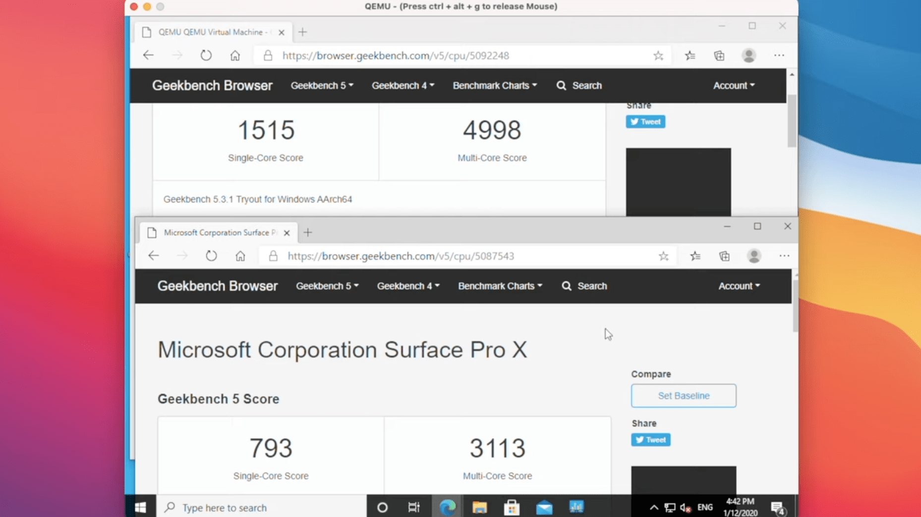 Oltre ad eseguire Windows 10 su Apple Silicon, l’ingegnere AWS ha eseguito vari test benchmark e i risultati sono a dir poco impressionanti. Windows 10 su un M1 ha ottenuto un punteggio single-core di 1.288 e multi-core di 5.685, mentre il Surface Pro X 793 in single-core e 3.113 in multi-core.