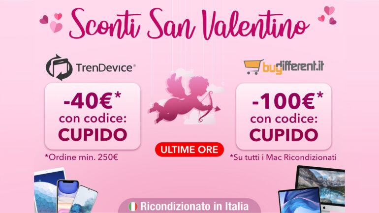 Ricordatevi quindi che inserendo il codice CUPIDO su TrenDevice, ottenete subito 40€ di sconto per ogni ordine minimo di 250€. Su BuyDifferent, sempre con il codice CUPIDO, lo sconto è di 100€, valido su tutti i Mac Ricondizionati. La promozione di San Valentino TrenDevice e BuyDifferent termina oggi 10 Febbraio alle ore 23:59: non fatevi scappare questa occasione!