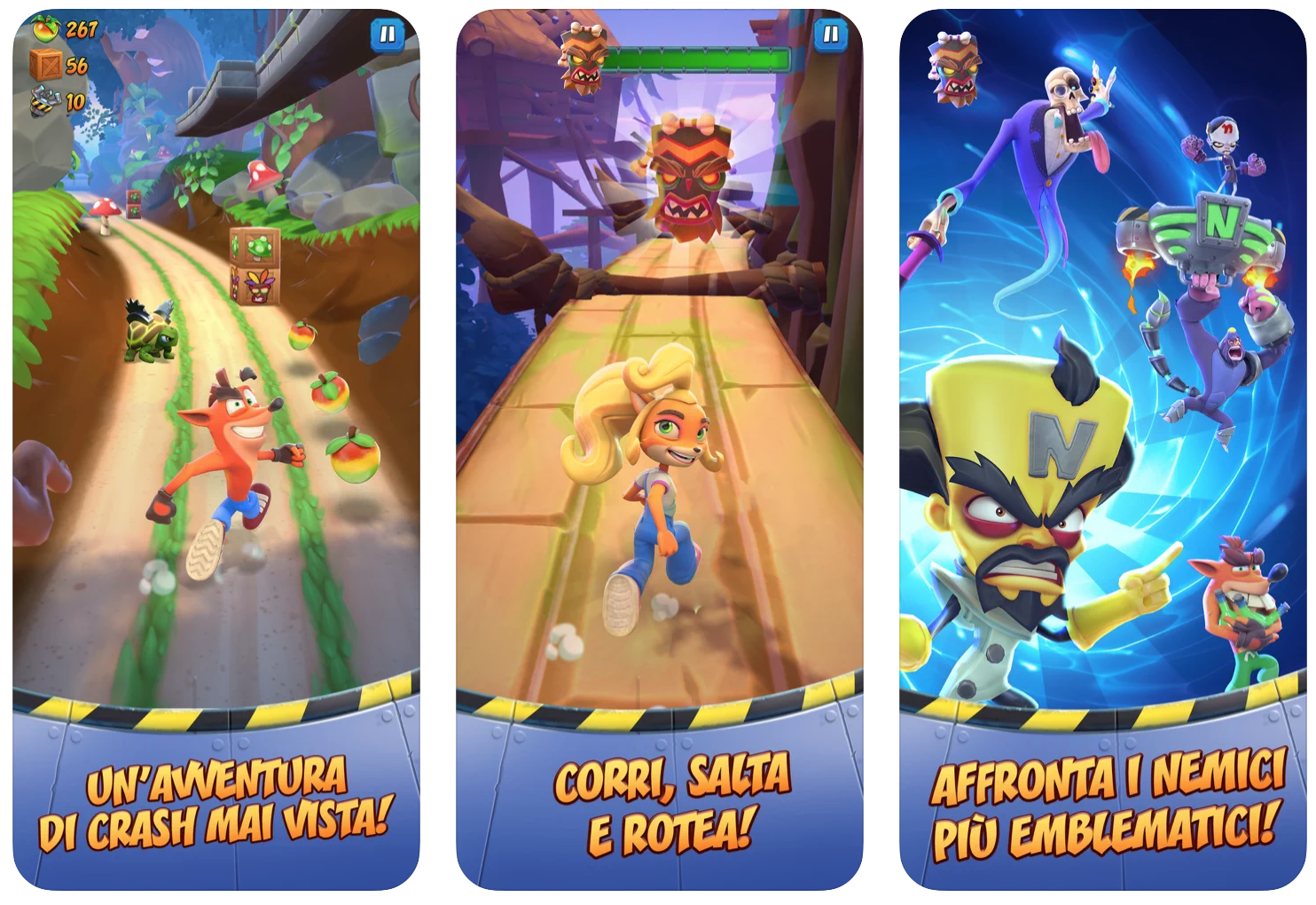Si tratta infatti di un endless runner in cui scopriremo tanti livelli ed ambientazioni con lo scopo raccogliere le gemme del potere. Nel gameplay dovremo prendere le mele, saltare, roteare, rompere scatole di legno, evitare quelle esplosive e sconfiggere il Dr. Neo Cortex con i suoi scagnozzi.