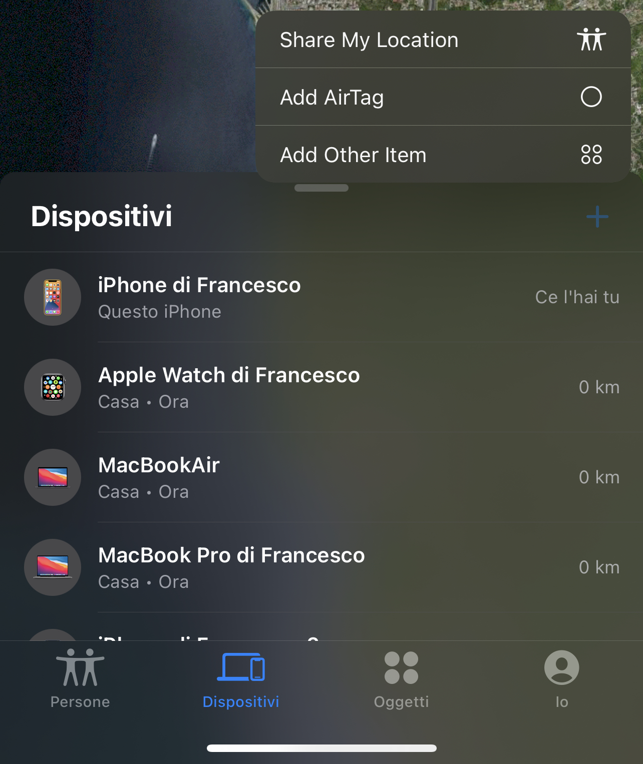 Aggiunto un nuovo pulsante “+” nell’app Dov’è per condividere la posizione, aggiungere un AirTag o aggiungere un altro elemento.