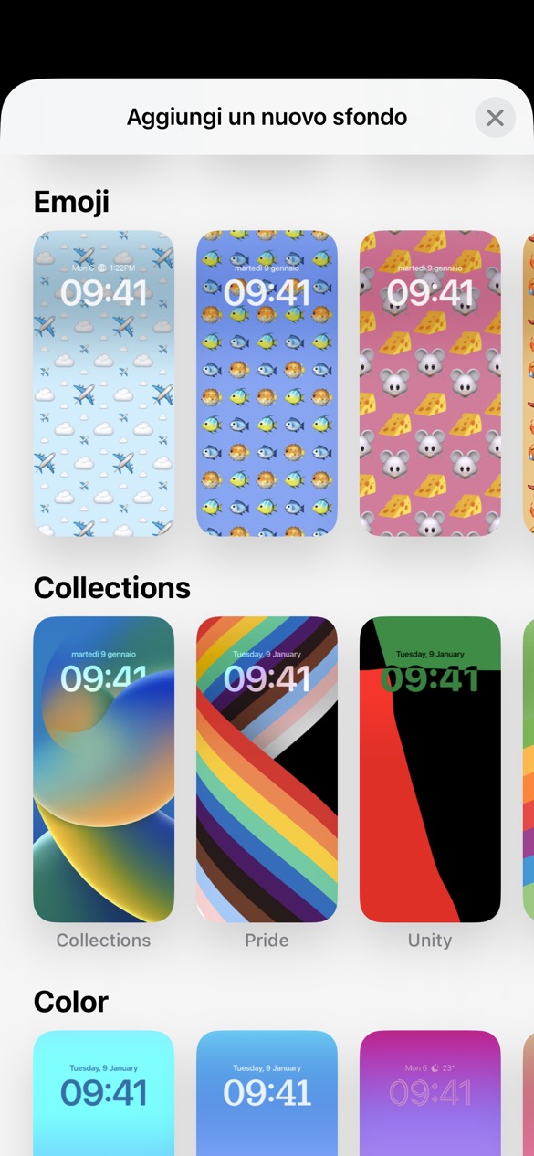 Il primo sfondo che ho scelto è quello visto durante la presentazione di iOS 16, che trovate per primo sotto il menu “Collections”. Scegliendo questo template, potremo personalizzare le prime tre righe, ovvero: