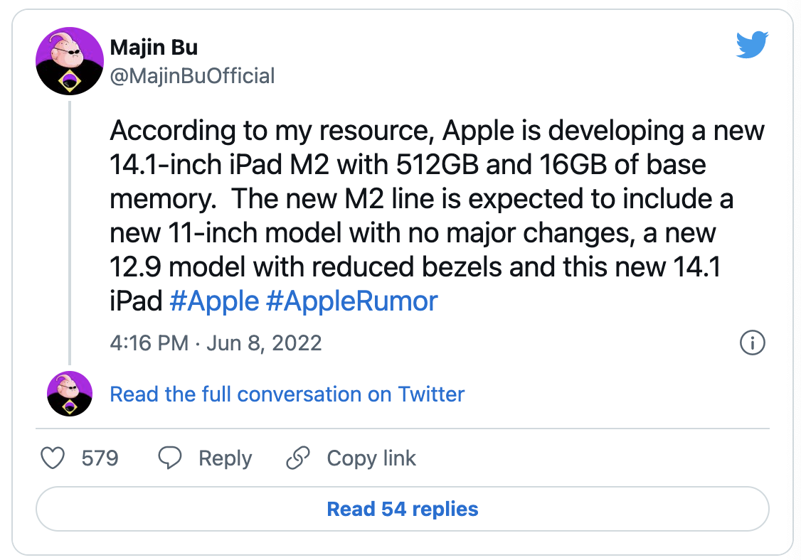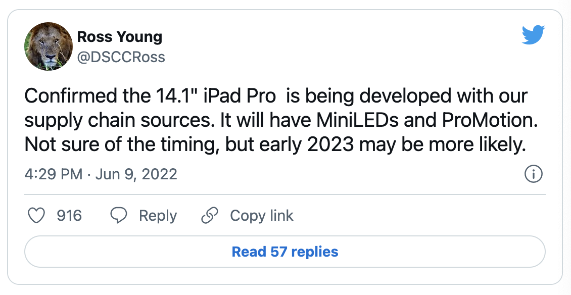 Concludiamo con il vociferato iPad Pro con display mini-LED da 14 pollici. A far circolare l’indiscrezione è stato Ross Young, che – ad onor del vero – ha ripreso quanto scritto prima di lui su Twitter dal noto leaker Majin Bu.