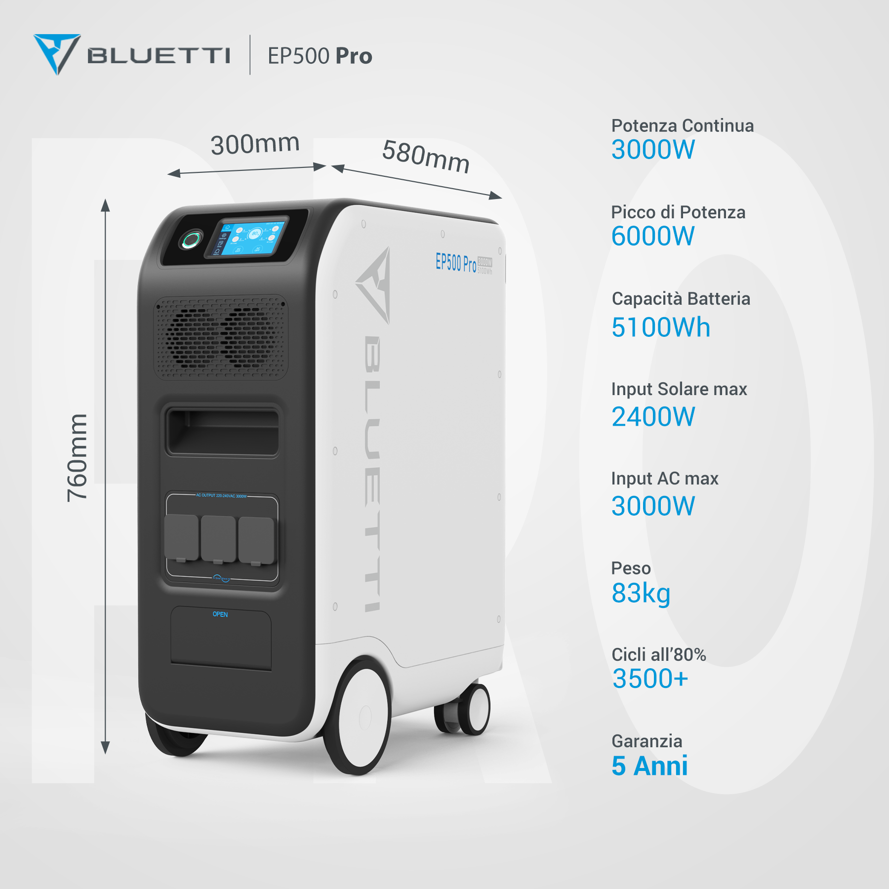 Bluetti lancia ufficialmente il generatore solare portatile EP500Pro, un sisitema di accumulo dell’elettricità da 5100Wh. Si tratta di una vera e propria super batteria LiFePO4 che può fungere da riserva di energia da utilizzare in caso di necessità, inclusi i blackout. EP500Pro può anche immagazzinare l’energia prodotta dal sistema fotovoltaico rendendo disponibile l’energia solare a tutte le ore del giorno. Bluetti EP500Pro è dotato di un inverter ad onda sinusoidale pura da 3000W con un picco da 6000W.