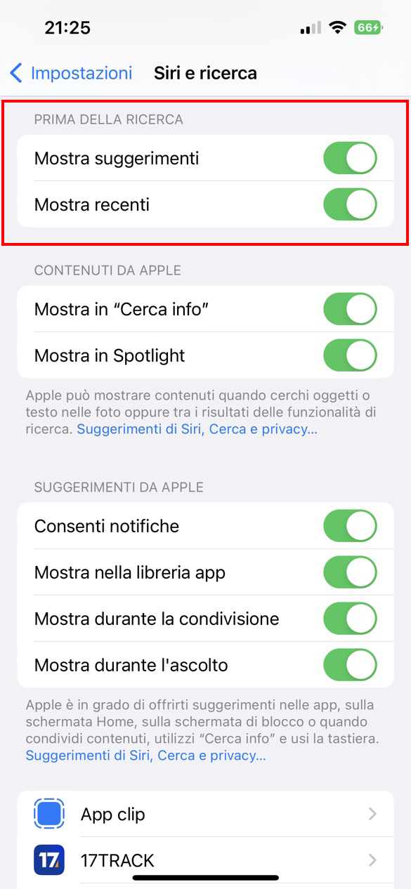 5. In Impostazioni > Siri e Cerca > è ora possibile disattivare i suggerimenti di Siri come le applicazioni che potremmo voler aprire piuttosto che una cronologia delle ultime cose che abbiamo cercato. Basta disattivare gli interruttori in corrispondenza di “Mostra suggerimenti” e “Mostra Recenti” entrambi catalogati sotto la voce “Prima della ricerca”. D’ora in avanti, quando abbasseremo la schermata Home, visualizzeremo soltanto il box di ricerca subito sopra la tastiera, tenendo la restante schermata superiore completamente vuota.