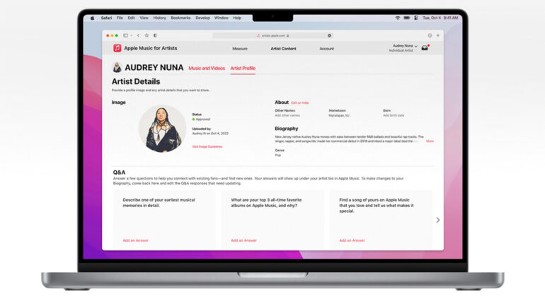 Apple ha annunciato che artisti e band possono ora personalizzare la propria pagina del profilo di Apple Music con una biografia personalizzata e la possibilità di aggiungere la propria città natale, la data di nascita o l’anno di formazione e altro ancora. Gli artisti possono anche aggiungere rapidamente testi per i loro brani sul servizio.