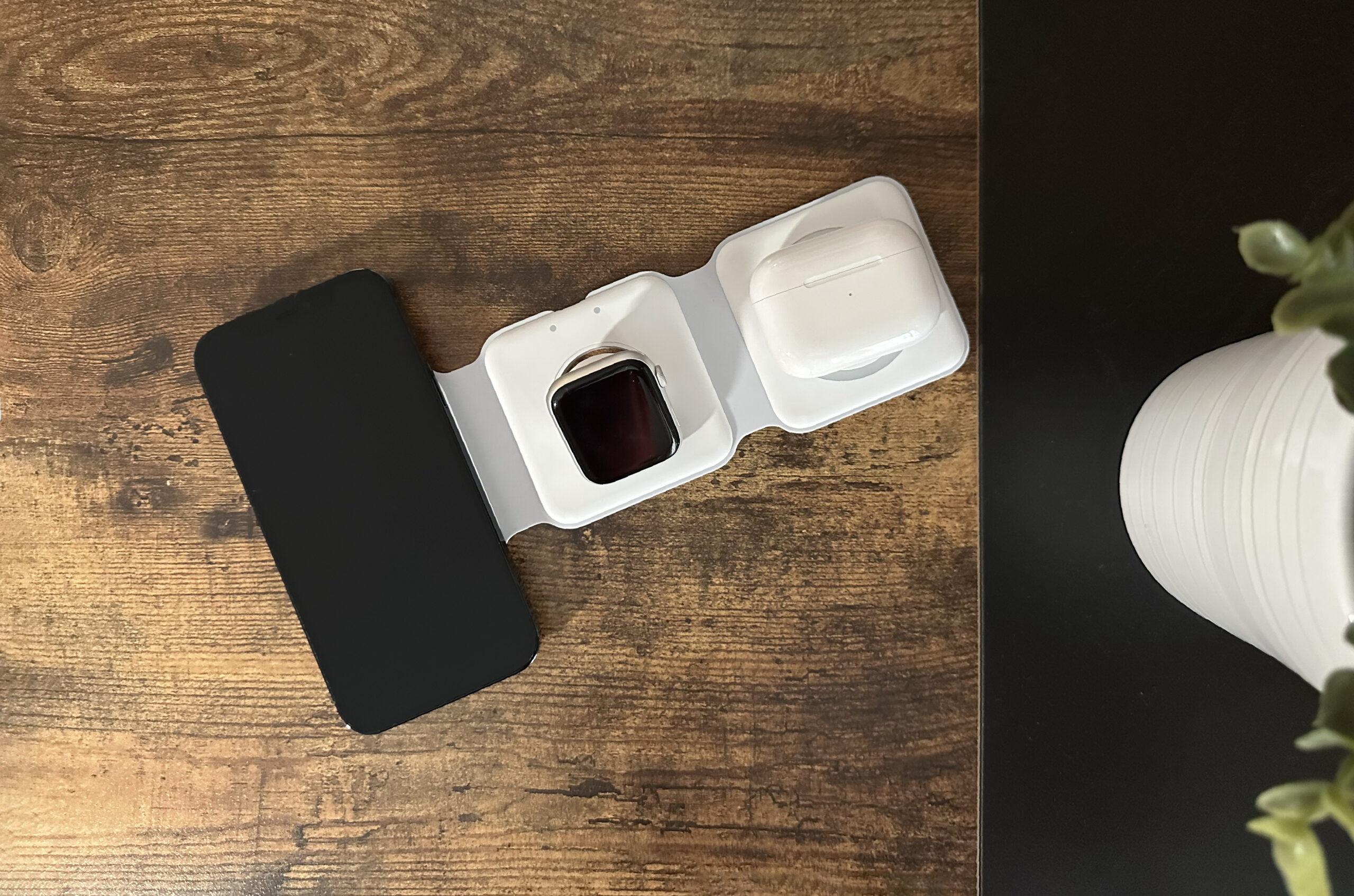 Il MegFold è un tappetino molto simile a quello di Apple ma con 3 bobine di ricarica al posto di 2. Può ricaricare un iPhone con MagSafe (o qualsiasi altro smartphone), un Apple Watch ed un qualsiasi altro dispositivo dotato di ricarica wireless come ad esempio le AirPods.