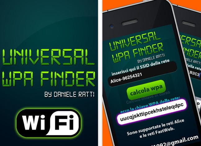 Universal WPA Finder è l’app che ti permette di ritrovare la password WPA di una rete Alice o Fastweb. E’ semplicissimo usarlo: basta mettere il nome della rete e premere il pulsante “Calcola WPA”.