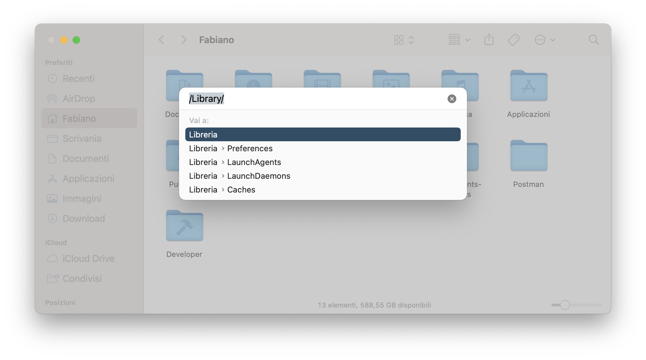 2. Scriviamo /Library/ e clicchiamo su invio. Individuiamo la cartella LaunchAgents ed entriamo.