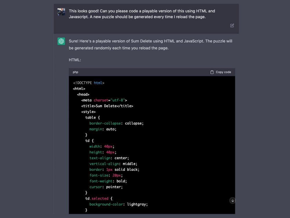 In men che non si dica, Chat GPT ha fornito tutto il codice necessario ed infine gli è stato chiesto anche di generare un codice CSS affinchè il gioco potesse risultare più piacevole graficamente.