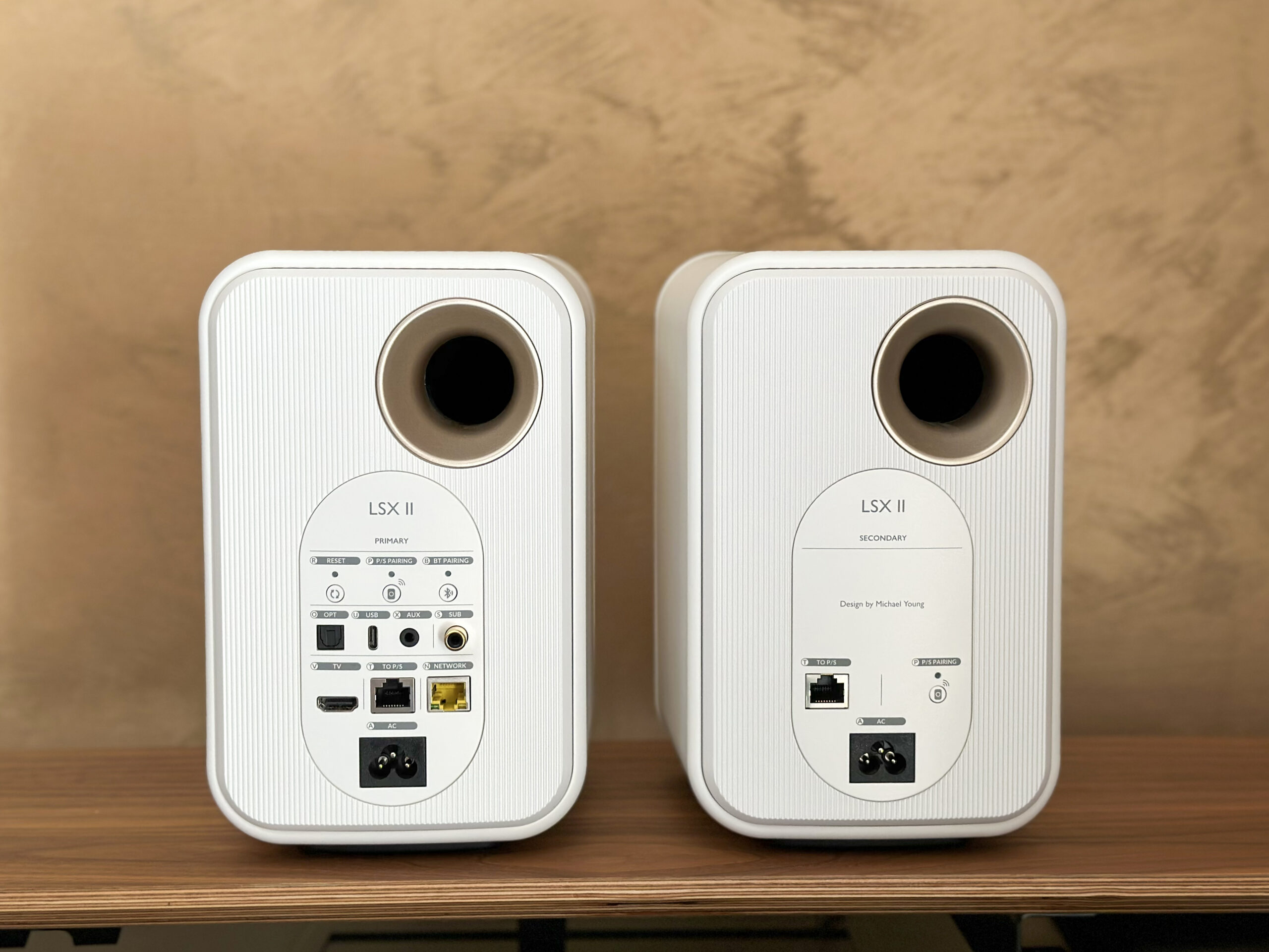 Vanno alimentati singolarmente attraverso due cavi distinti. Gli altoparlanti non sono uguali tra loro ma uno funge da principale (con tutti gli ingressi) ed uno da secondario, ricevendo il segnale dal primo. E’ possibile collegare gli altoparlanti tra loro sfruttando l’apposita porta Ethernet RJ45 (con il cavo fornito in confezione) oppure in wireless. Con il cavo si veicola un segnale in PCM a 96 kHz / 24-bit mentre in wireless chiaramente si scende a 48 kHz / 24-bit.