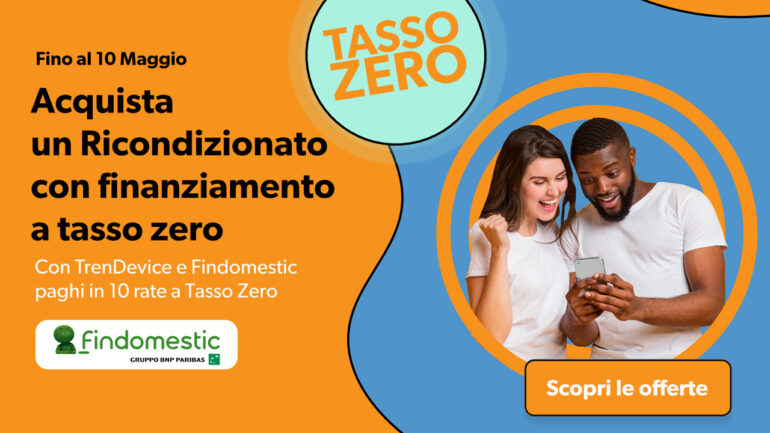 *Messaggio pubblicitario con finalità promozionale. Offerta di credito finalizzato valida dal 31/03/2023 al 31/12/2023 come da esempio rappresentativo: Prezzo del bene € 999,00 Tan fisso 0% Taeg 0%, in 10 rate da € 99,90 costi accessori dell’offerta azzerati. Importo totale del credito € 999,00. Importo totale dovuto dal Consumatore € 999,00. Findomestic ti ricorda, prima di sottoscrivere il contratto, di prendere visione di tutte le condizioni economiche e contrattuali, facendo riferimento alle Informazioni Europee di Base sul Credito ai Consumatori (IEBCC) sul percorso online. Salvo approvazione di Findomestic Banca S.p.A.. TrenDevice Spa opera quale intermediario del credito per Findomestic Banca S.p.A., non in esclusiva.